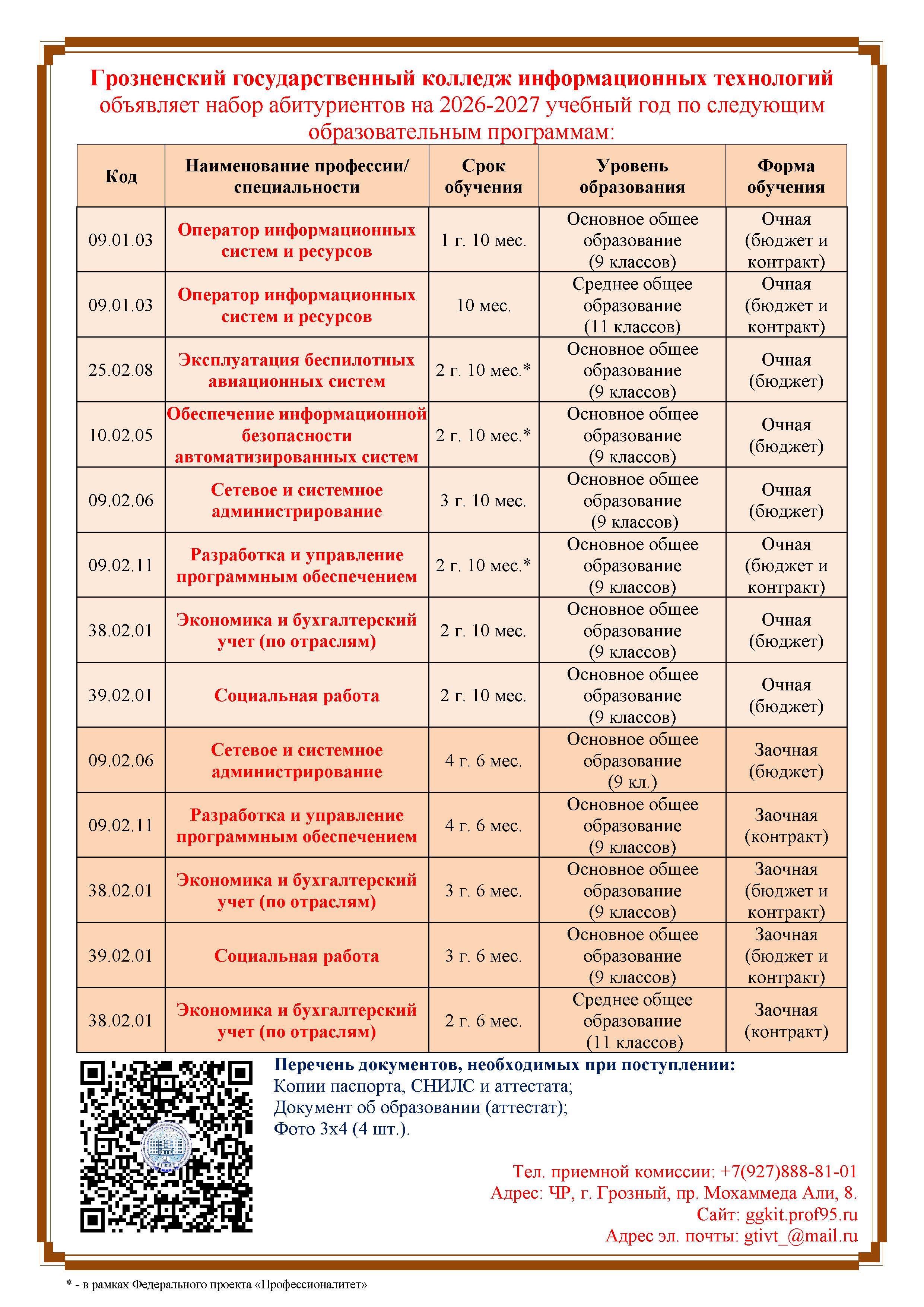 Перечень специальностей и профессий по которым ГБПОУ ГГКИТ объявляет прием 2026-2027 учебный год