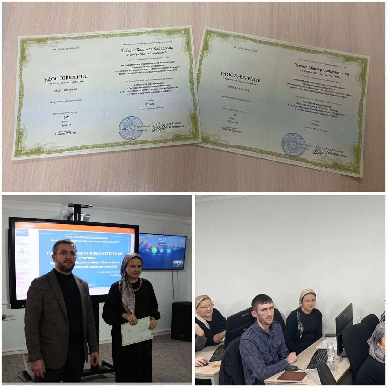 Курсы проводила начальник отдела оценки качества среднего профессионального образования ГБУ "ЦОКО" Селезнёва Светлана Викторовна. Совместно с коллегами из других ОУ программу курсов освоили также сотрудники ГБПОУ «ГГКИТ»:- Ганчаев М.С. - зам.директора по УР;- Такаева Х.Х. - зав.кафедрой ЭиУ. По результатом курсов слушатели получили удостоверения о повышении квалификации.