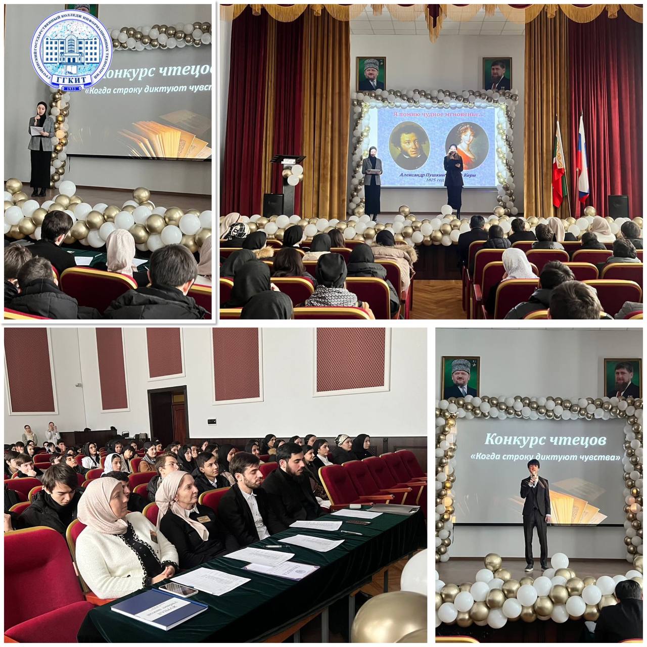 Посвященный Году чтения в ЧР, который организовали и провели преподаватели кафедры общеобразовательных предметов: Даниева З. А., Махаури З. М., Деналбекова Х. У., Техиева З. Ш., Загаева М.М., Газимагомаева З. А.. Ведущие конкурса Резванова Д., Чатаева Р. рассказали о творческой биографии поэтов с просмотром видеороликов. Прослушали стихотворения в исполнении участников. Выступление студентов оценивало жюри. Все участники серьезно подготовились, блестяще выступили, показав своё мастерство исполнения.