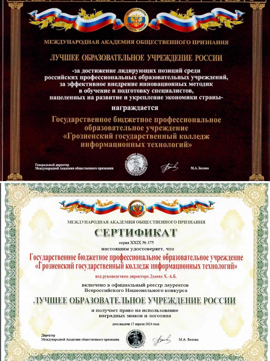 17.05.2024ГБПОУ "ГГКИТ", под руководством директора Дааева Хож-Ахмеда Буаровича, включён в официальный реестр лауреатов Всероссийского национального конкурса Лучшее образовательное учреждение России!