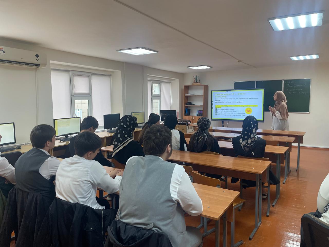 Одновременно прошла проба «1С: Бухгалтерия» под руководством преподавателя Татаевой Иман Магомедовны. Школьники выполнили типовые операции в программе 1С: добавили контрагентов, оформили первичные документы и сформировали бухгалтерские проводки. Это дало им первое представление о работе бухгалтера в условиях цифровой экономики.